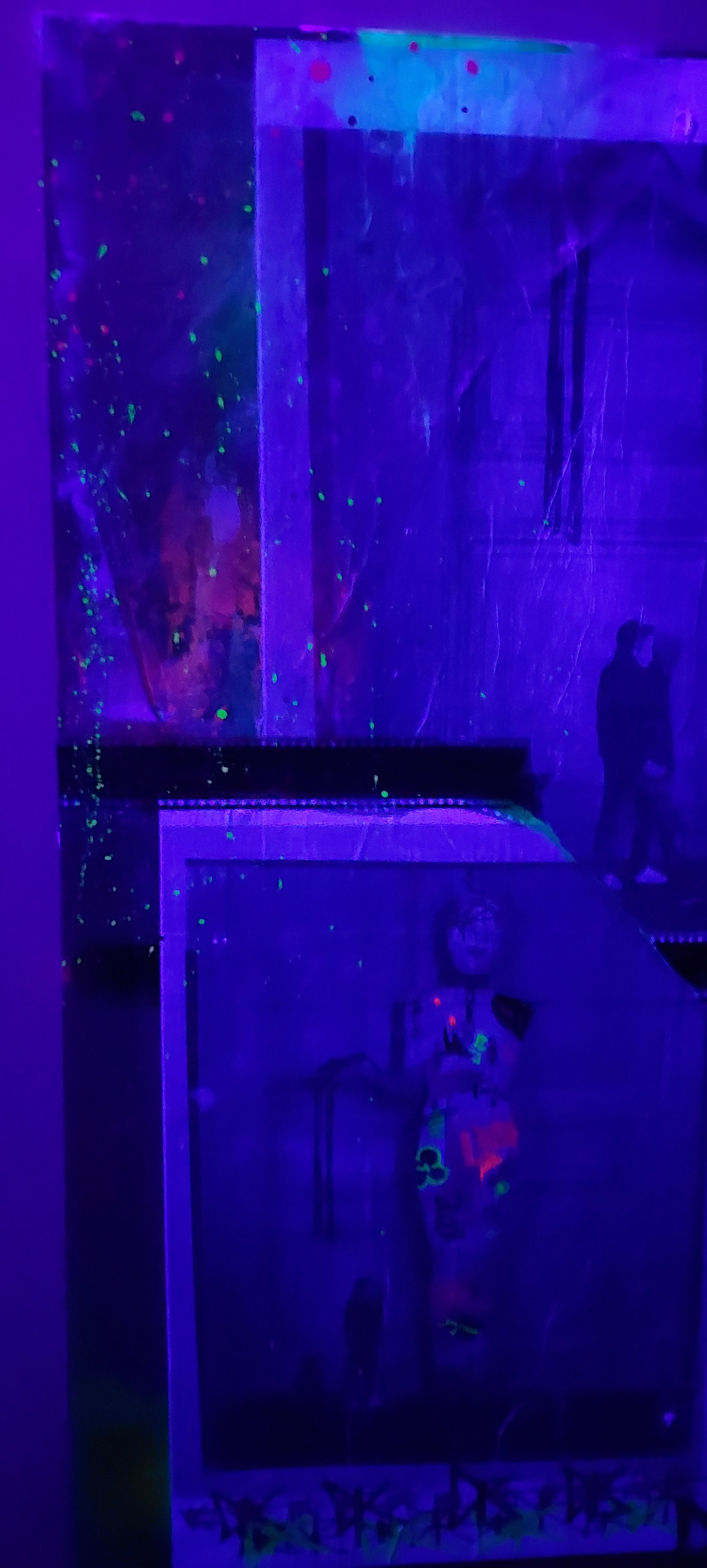 Striking image of a woman in bondage looming large over a couple of guys, hand finished with markers, acrylic and spray paint, film and other materials, wheatpasted to a wooden board canvas. Vivid and colorful, this version comes alive with UV reactive paint and secret glow in the dark touches.